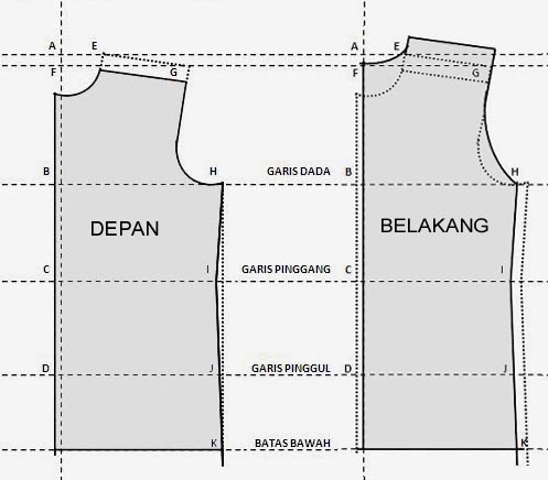 • Posisi garis dada, pola depan = seperempat lingkar dada ditambah 1 cm, sedangkan pola belakang = seperempat lingkar dada dikurangi 1 cm.   Jadi, pada posisi garis dada, lebar pola belakang = lebar pola depan dikurangi 2 cm.